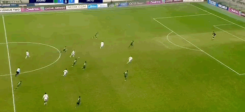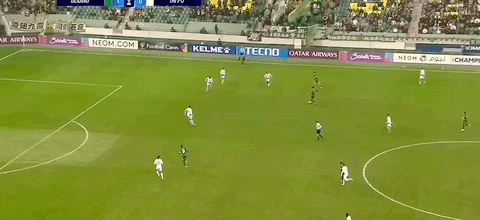 第11分鐘,王剛傳中法比奧背身拿球后挑傳身后,張玉寧沒有跟上